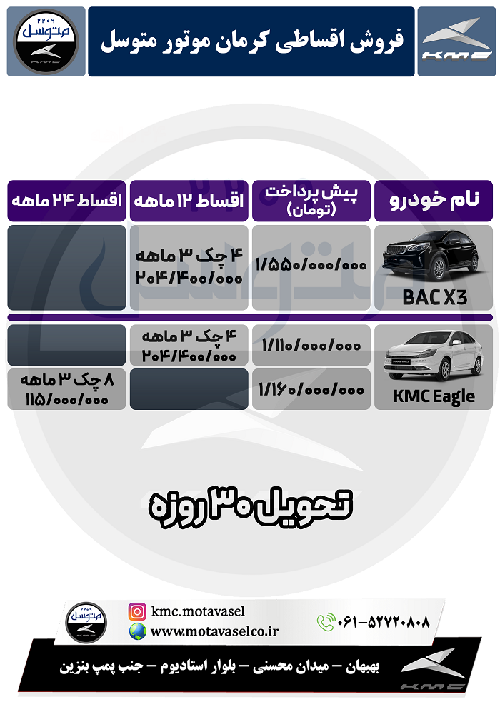 قیمت : 1,110,000,000 تومان فروش اقساطی محصولات کرمان موتور با تحویل 30 روزه در نمایندگی کرمان موتور متوسل